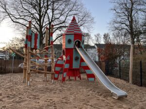 Heute konnte das Außengelände der Drachenkinder-Bremen, am Standort Huchting, final abgenommen werden. Der große Spielturm in Form einer Weltraumrakete, rundet das Thema Raumfahrt, neben Marsrower, Satellitenspielgeräten und Mondlandschaft gelungen ab.